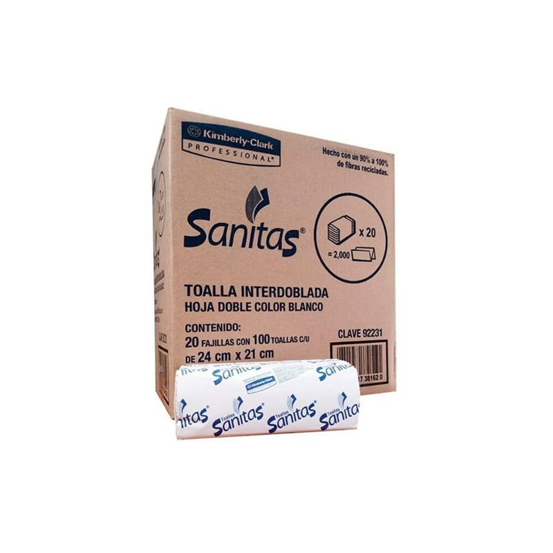 Toalla Interdoblada Sanitas caja con 20 paquetes de 100 piezas cada uno color Blanco hoja 2 ancho 24 x 21cm